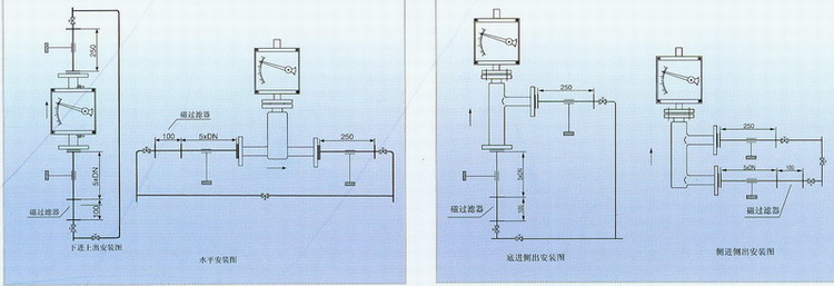 流量計應垂直安裝,流量計中心線與鉛垂線的夾角不超過5°。在累計的上游須保證五倍公稱通徑的入口直管段,下游保證250mm出口直管段。如果介質中含有固定雜質,應在流量計上游加裝過濾器,如果介質中含有鐵磁性物質,應在流量計的上游安裝磁過濾器。為了便于維護和清洗且不影響,建議安裝旁通管路。