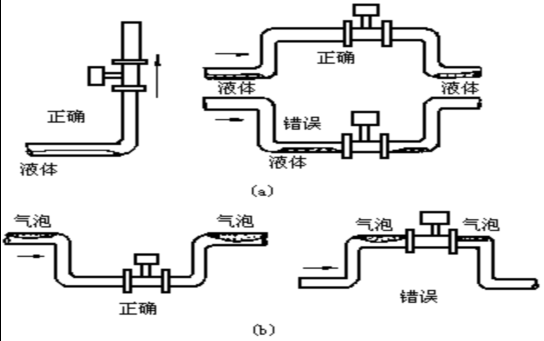 7. 測量液體時,為了保證管內充滿液體,所以在垂直或傾斜管道安裝儀表時,應該保證液體流動方向從下而上。若管道內含少量氣體,為了防止氣體進入儀表測量管,儀表應安裝在管線的較低處。